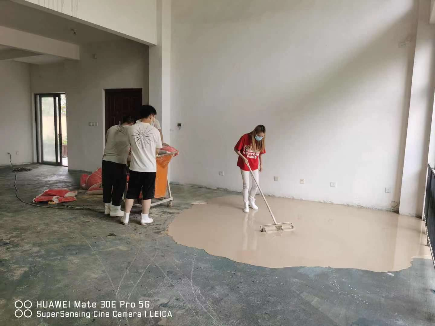 本次活動地點為一棟5層樓的毛坯房,總面積約450㎡。活動前期已將地面的沙塵和小石子清理干凈,并刷上一層界面劑,界面劑起到防水、封閉的作用,避免自流平流動過程中失水過快,降低流動性,或水分下滲形成氣泡針孔。