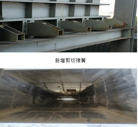 檢修班在接到任務(wù)后,立即對該問題產(chǎn)生的根源進(jìn)行梳理,對卸料應(yīng)力進(jìn)行計算和綜合分析,在確保徹底消除隱患、穩(wěn)定可靠、簡單易行和力爭最低成本的原則下研究可行性技改方案,決定采取四管齊下 :1.在每個石膏倉與框架接觸部位均布增設(shè)剪切彈簧10個(使應(yīng)力緩釋)。2.將倉內(nèi)錐段原不沾板改為不銹鋼板(滿焊)并直段噴涂鱗片樹脂(使石膏緩降,減小沖擊并消除腐蝕)。3.在真空泵出口增設(shè)減震膨脹節(jié)(隔斷設(shè)備運(yùn)行震動)。4.繼續(xù)對卸料空氣炮深挖潛能進(jìn)行技改(以致順暢下料)。